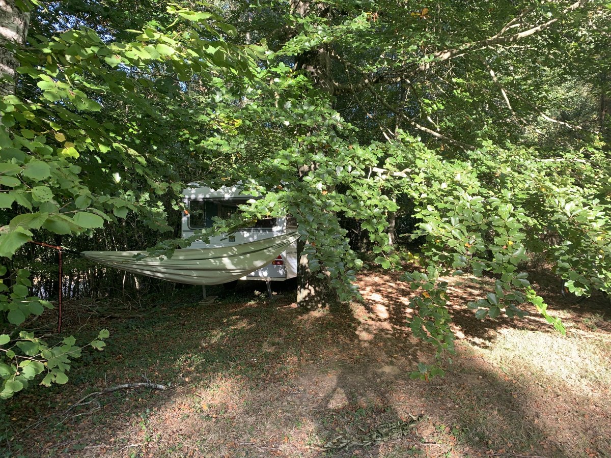 Une caravane sous un magnifique hêtre avec un lit de 140cm (possibilité d'un deuxième lit) et une petite cuisine.